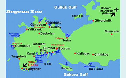 Ihr Zielflughafen ist Bodrum. Von dort fahren Sie bequem mit dem Taxi direkt zur Villa Lindos. Die Fahrt dauert ca. eine Stunde.
